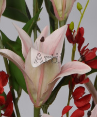 Embrace the captivating allure of the tropics with our Artificial Tiger Lily Arrangement (Fabric)! Crafted from delicate yet durable fabric, this enchanting creation showcases a harmonious dance of fiery red and soft pink tiger lilies, nestled amidst lush green foliage, offering year-round vibrancy and exotic charm without the demands of real plants.