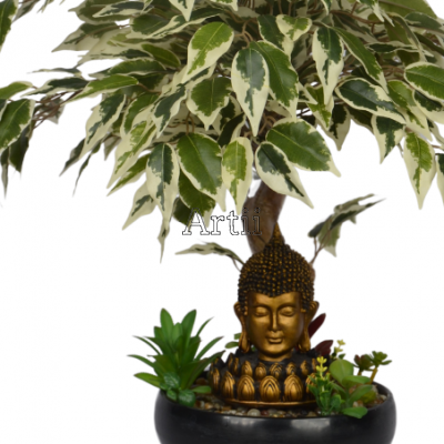 Embrace the serene beauty of nature and the wisdom of Eastern philosophy with this exquisite VR Ficus Bonsai with Buddha, meticulously crafted from high-quality fabric in captivating shades of green and white. This unique faux bonsai transcends the ordinary, combining the graceful charm of a VR Ficus with the calming presence of a serene Buddha statue, offering a haven of inner peace and Feng Shui harmony for your home.